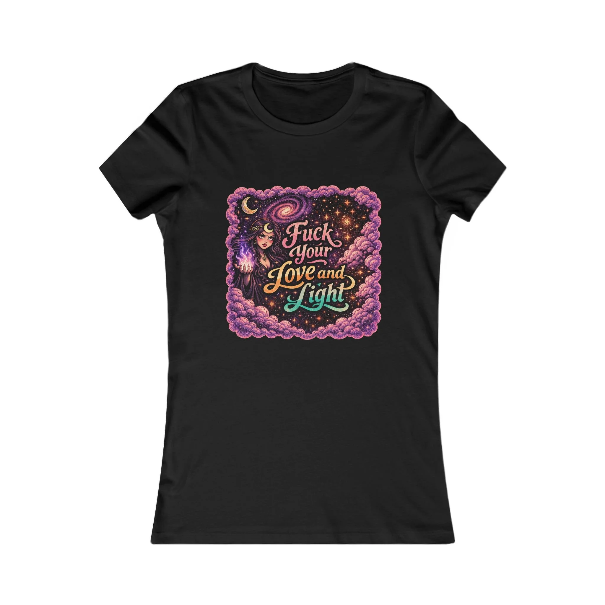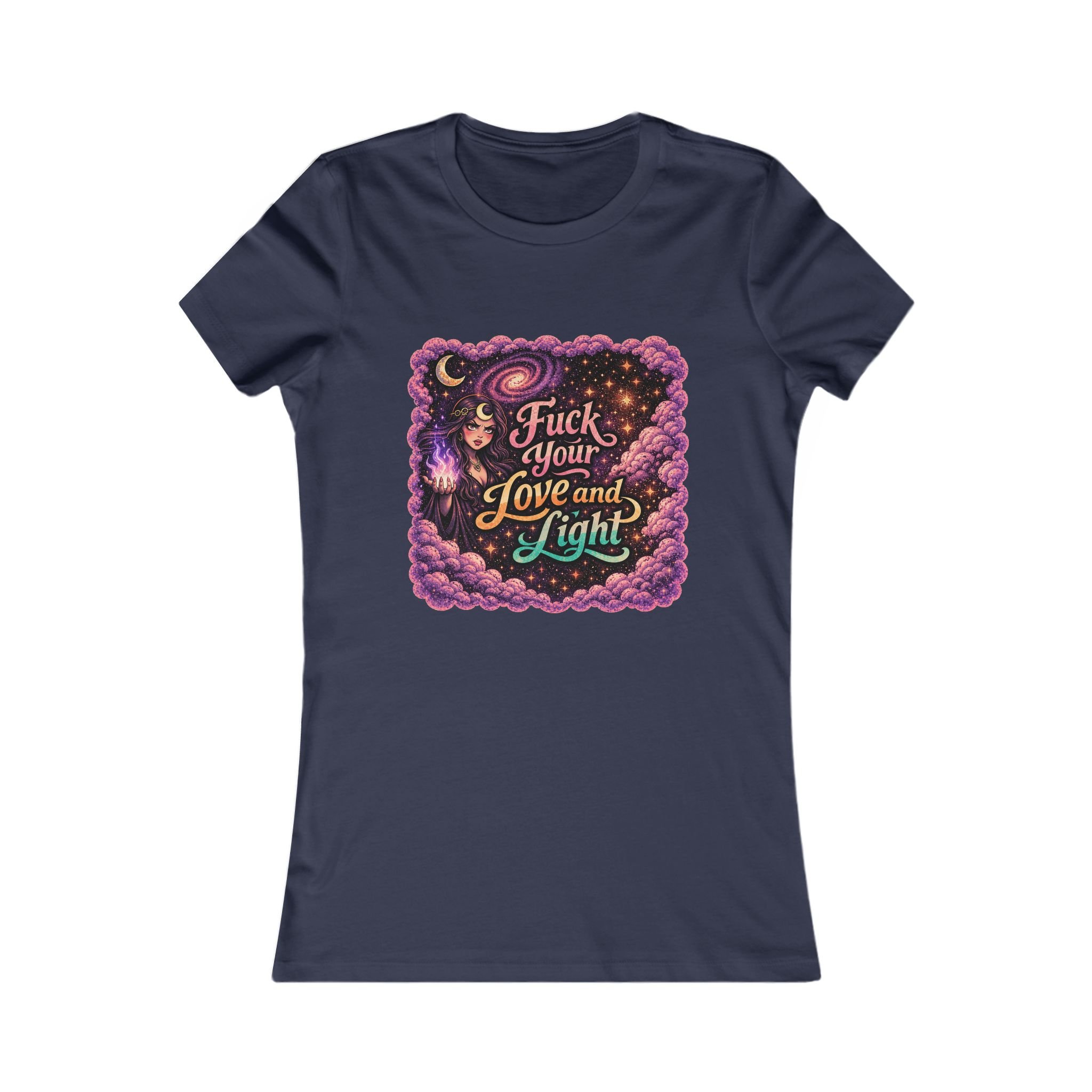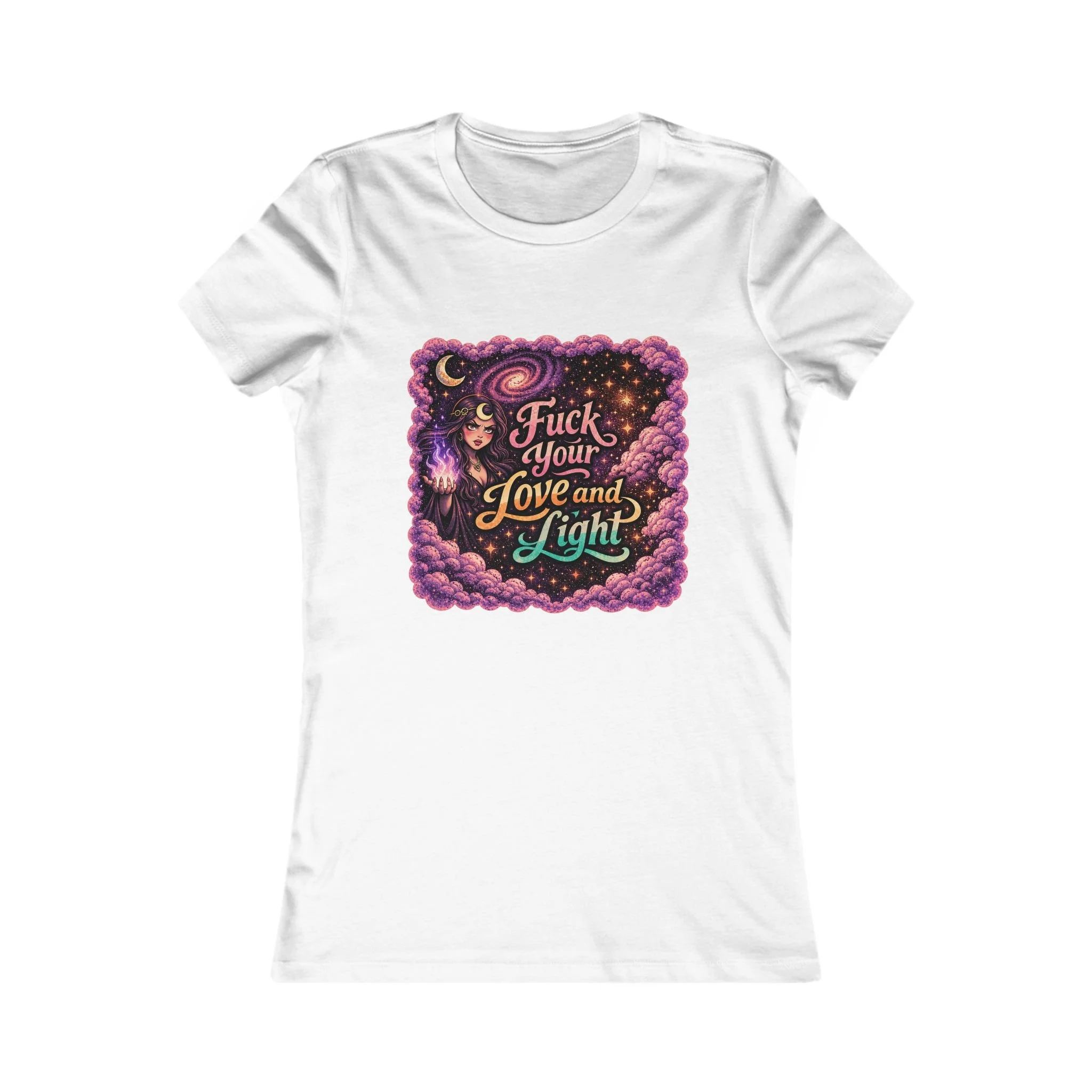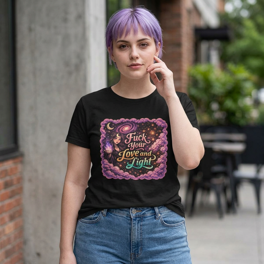 For the babe who's tired of love and light spirituality. This slim-fit tee carries attitude with hand-drawn, retro-inspired artwork that reads like a midnight declaration. Soft, lightweight cotton sits close to the body for a flattering silhouette while the colorful, swirling design pops against solid backgrounds. Wear it on late-night city walks, at small shows, or layered under a jacket to let the graphic do the talking — it’s for people who prefer bold honesty over polite small talk. The longer body length and ribbed collar keep the shape steady through wear, and the tear-away label keeps comfort uncrowded. Runs slightly small; consult sizing if you’re between sizes.