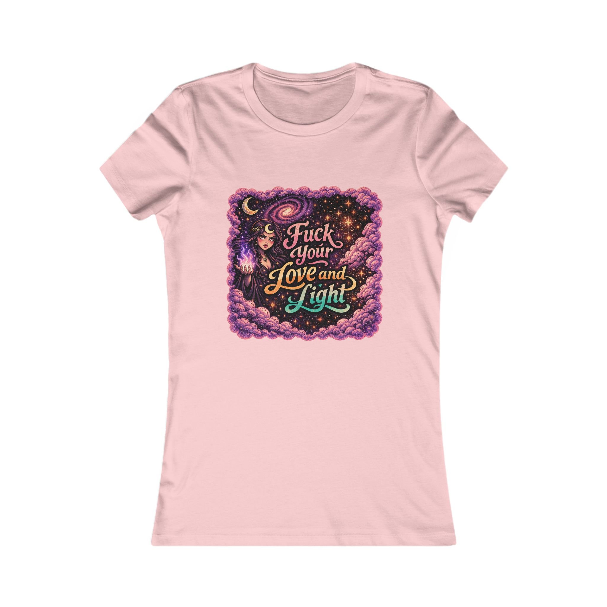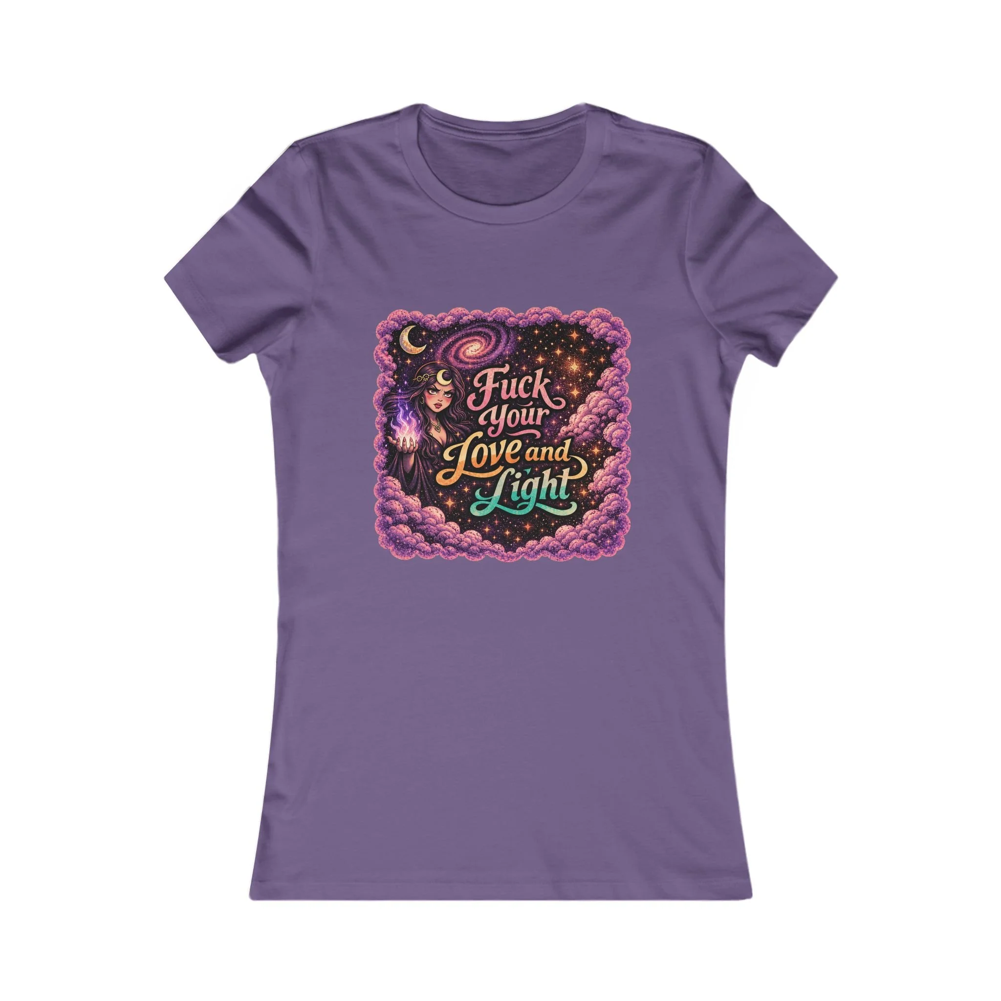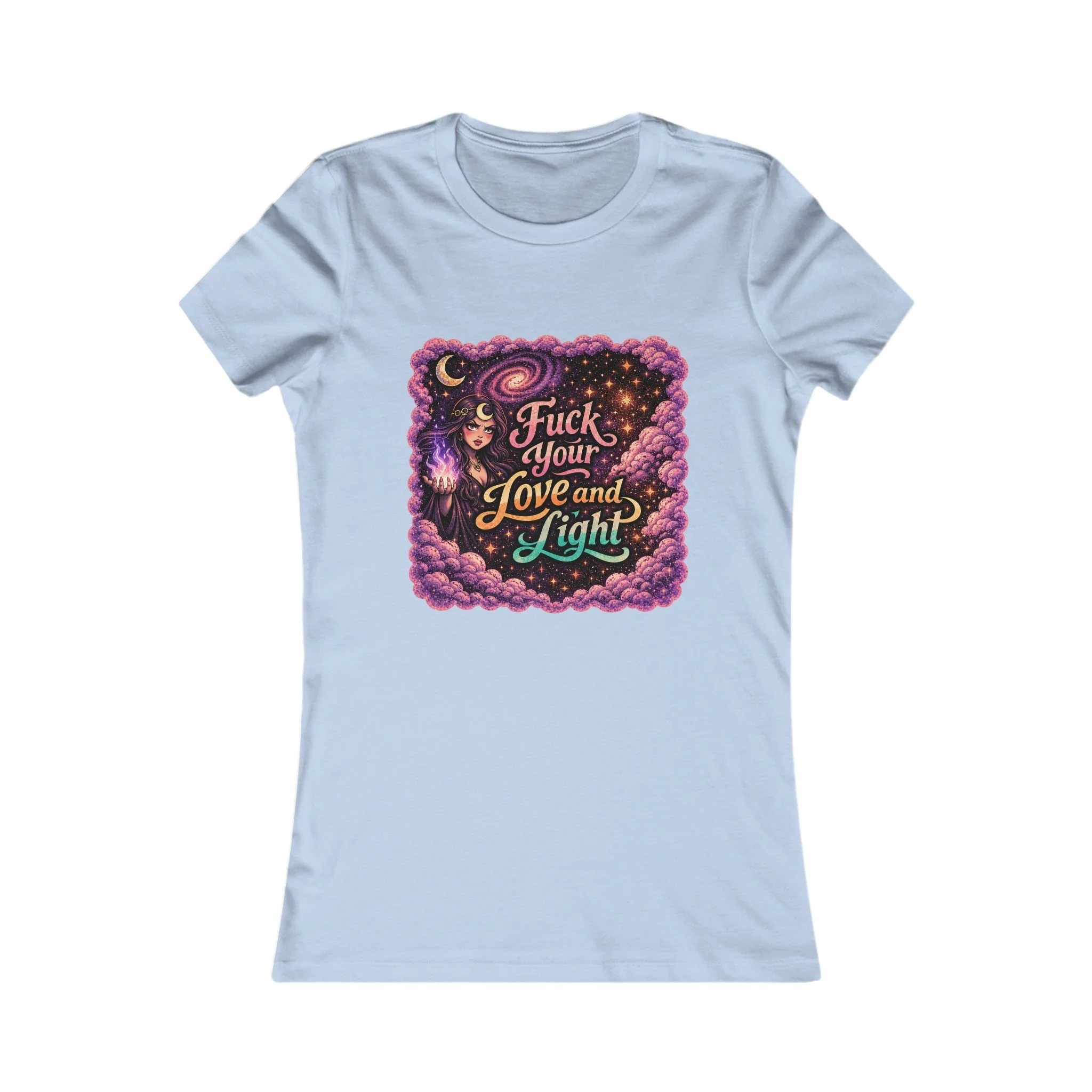 For the babe who's tired of love and light spirituality. This slim-fit tee carries attitude with hand-drawn, retro-inspired artwork that reads like a midnight declaration. Soft, lightweight cotton sits close to the body for a flattering silhouette while the colorful, swirling design pops against solid backgrounds. Wear it on late-night city walks, at small shows, or layered under a jacket to let the graphic do the talking — it’s for people who prefer bold honesty over polite small talk. The longer body length and ribbed collar keep the shape steady through wear, and the tear-away label keeps comfort uncrowded. Runs slightly small; consult sizing if you’re between sizes.